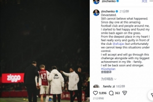 遭遇膝盖重伤!津琴科社媒:极度崩溃,我要向阿贾克斯表达歉意