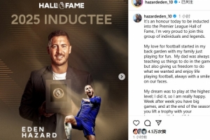 24体育直播:2025年10月29日讯 英超官方宣布,切尔西名宿阿扎尔入选英超名人堂。阿扎尔更新社媒,谈到自己得奖的兴奋之情。