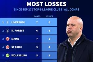 24体育直播:2025年10月30日讯 利物浦0-3不敌水晶宫,各项赛事仅7场比赛1胜6负,数据统计显示,利物浦是同一时期五大联赛所有球队中输球场次最多的。