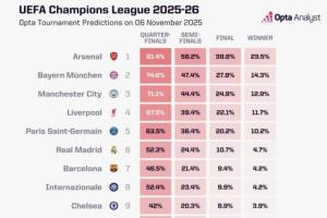 24体育直播:2025年11月06日讯 欧冠联赛阶段第4轮的比赛已经全部结束,OPTA超算更新了欧冠夺冠概率。