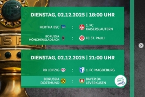24体育直播:2025年11月6日讯 德国杯1/8决赛各场开球时间公布,12月3日4点勒沃库森vs多特蒙德,4日3点45柏林联合vs拜仁。