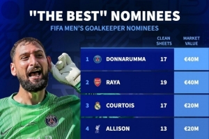 24体育直播:2025年11月7日讯 FIFA公布了年度最佳男足门将候选名单,德国转会市场列出了入围者身价排名,多纳鲁马、拉亚4000万欧居首。