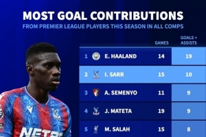 24体育直播:2025年11月7日讯 德国转会市场统计了英超球员本赛季各赛事的参与进球数量,并列出榜单,哈兰德参与19球居首,萨尔参与10球次席。