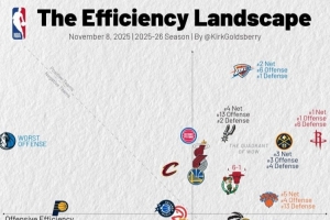 24体育直播:2025年11月7日讯 今天,数据专家Kirk Goldsberry更新了本赛季球队的攻防效率值表。
