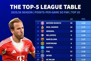 24体育直播:2025年11月08日讯 德转统计了新赛季至今五大联赛球队的场均积分榜,其中拜仁全胜场均3分排在榜首,皇马、阿森纳分列二三。