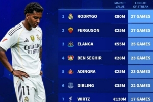 24体育直播:2025年11月8日讯 德转盘点了目前遭遇进球荒的攻击手,其中罗德里戈27连续27场进球荒居首,以下为具体情况(只统计身价2500万欧以上球员):