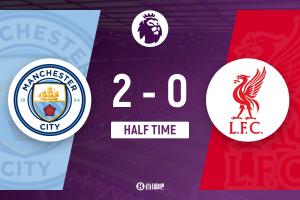 上半场补时7分钟,曼城2-0利物浦。