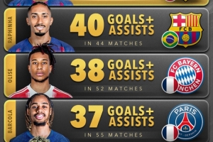 24体育直播:2025年11月10日讯 Score90统计了2025年五大联赛边锋在俱乐部+国家队比赛中参与进球的数量,并列出榜单。