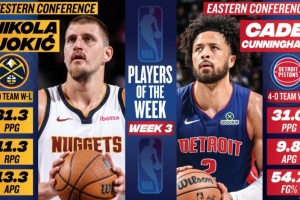 24体育直播:2025年11月11日讯 今日NBA官方宣布,活塞球星康宁汉姆和掘金球星约基奇当选本赛季第3周东、西部最佳球员。