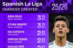 24体育直播:2025年11月12日讯 Squawka统计本赛季西甲创造机会次数,居莱尔、姆巴佩32次最多。