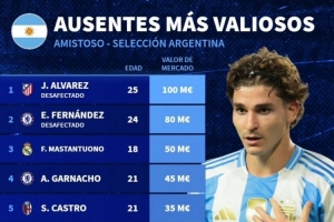 24体育直播:2025年11月12日讯 德国转会市场统计了缺席本期阿根廷队球员的身价,并列出榜单,阿尔瓦雷斯1亿欧居首,恩佐-费尔南德斯8000万欧次席。