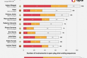 24体育直播:2025年11月12日讯 据Opta统计,姆巴佩本赛季联赛参与106次以射门终结的进攻,西甲球员中最多。