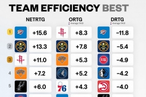 24体育直播:2025年11月14日讯 美媒Basketball University发布了赛季至今的各队净效率、进攻效率以及防守效率前十的帮当。其中雷霆净效率+15.6排名第一,进攻效率火箭+8.3排名第一,防守效率雷霆-11.8排名第一。
