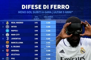 24体育直播:2025年11月15日讯 德国转会市场统计了2020-2021赛季以来球队在五大联赛中的场均失球,并列出场均失球最少榜单,皇马0.86球居首,国米、那不勒斯前三。