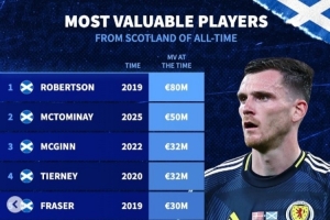 24体育直播:2025年11月16日讯 德转统计苏格兰球员历史身价排行榜,2019年罗伯逊8000万欧居首,今年麦克托米奈5000万欧第二。