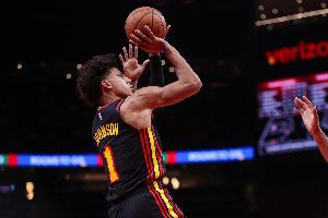 此役,杰伦·约翰逊出战,18中8,其中三分8中3,罚球6中6,得到25分8篮板9助攻3抢断1盖帽,正负值-7。