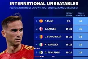 24体育直播:2025年11月20日讯 德国转会市场统计了本世纪球员国家队首秀之后的连续不败场次数据,并列出榜单,法比安·鲁伊斯连续41场不败居首。