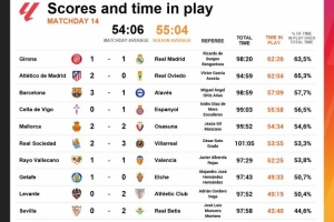 24体育直播:2025年12月2日讯 数据显示,赫罗纳1-1皇马是第14轮西甲净时间最长的比赛。
