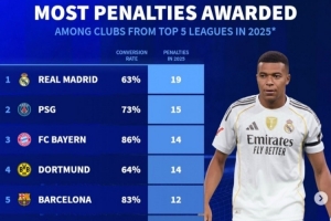 24体育直播:2025年12月4日讯 《转会市场》统计了2025年五大联赛俱乐部各项赛事获得点球情况,皇马位居榜首。