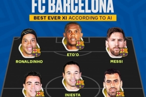 24体育直播:2025年12月6日讯 Onefootball社媒晒AI评出的巴萨队史最佳阵容,梅西、小罗、埃托奥组成锋线三叉戟。
