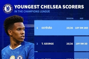 24体育直播:2025年10月23日讯 德国转会市场列出了切尔西队史欧冠最年轻进球者排名,埃斯特旺居首。
