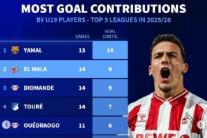 24体育直播:2025年12月18日讯 《转会市场》统计了本赛季五大联赛U19球员直接参与进球榜,亚马尔无悬念领跑。