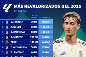 24体育直播:2025年12月24日讯 德国转会市场列出了2025年西甲球员身价上涨排名,赫伊森上涨5200万欧居首,居莱尔上涨4500万欧次席。