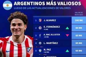 24体育直播:2025年12月27日讯 德国转会市场更新了各大联赛球员的身价,并列出阿根廷球员身价排名,阿尔瓦雷斯1亿欧居首。