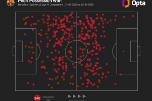 24体育直播:2025年12月29日讯 2025年即将结束,opta数据统计显示佩德里是本年度夺回球权次数最多的五大联赛非门将球员。
