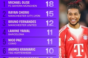 24体育直播:2025年12月31日讯 数据网站Squawka盘点了2025年五大联赛助攻榜,其中拜仁球员奥利塞居首,具体如下: