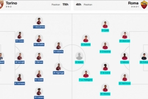 罗马首发:99-斯维拉尔;22-埃尔莫索、5-恩迪卡、23-詹卢卡·曼奇尼;43-韦斯利、17-科内、4-克里斯坦特、19-切利克;7-佩莱格里尼、14-马伦、21-迪巴拉。